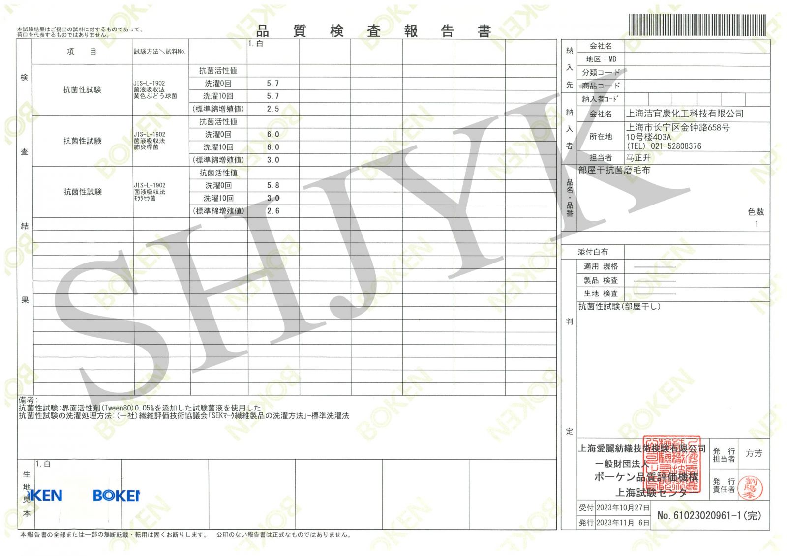 部屋干抗菌磨毛布-抗菌测试-BOKEN